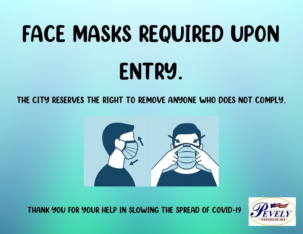On November 30th, 2020, The Board of Aldermen approved a mask mandate at City Hall for all employees, residents, guests, and elected officials. Masks are required upon entry to City Hall for daily activities and evening meetings. The City of Pevely reserves the right to remove anyone who refuses to comply with the mask mandate. We appreciate your cooperation in slowing the spread of COVID-19.