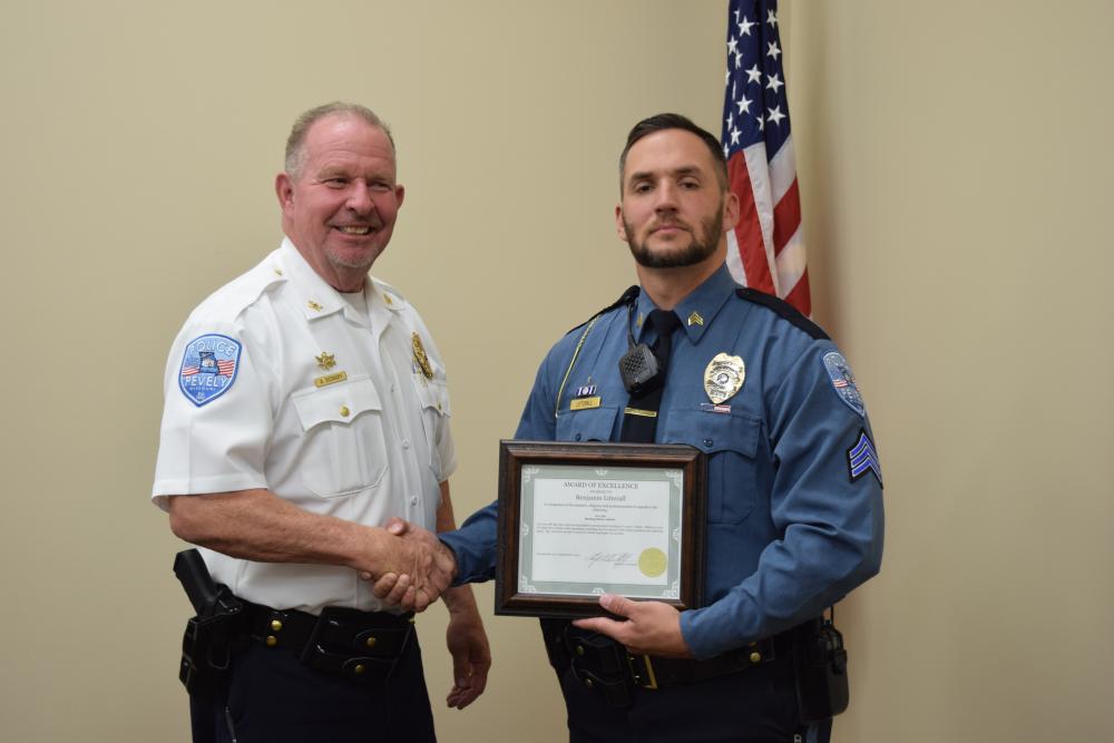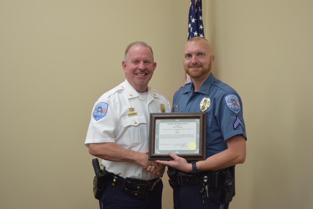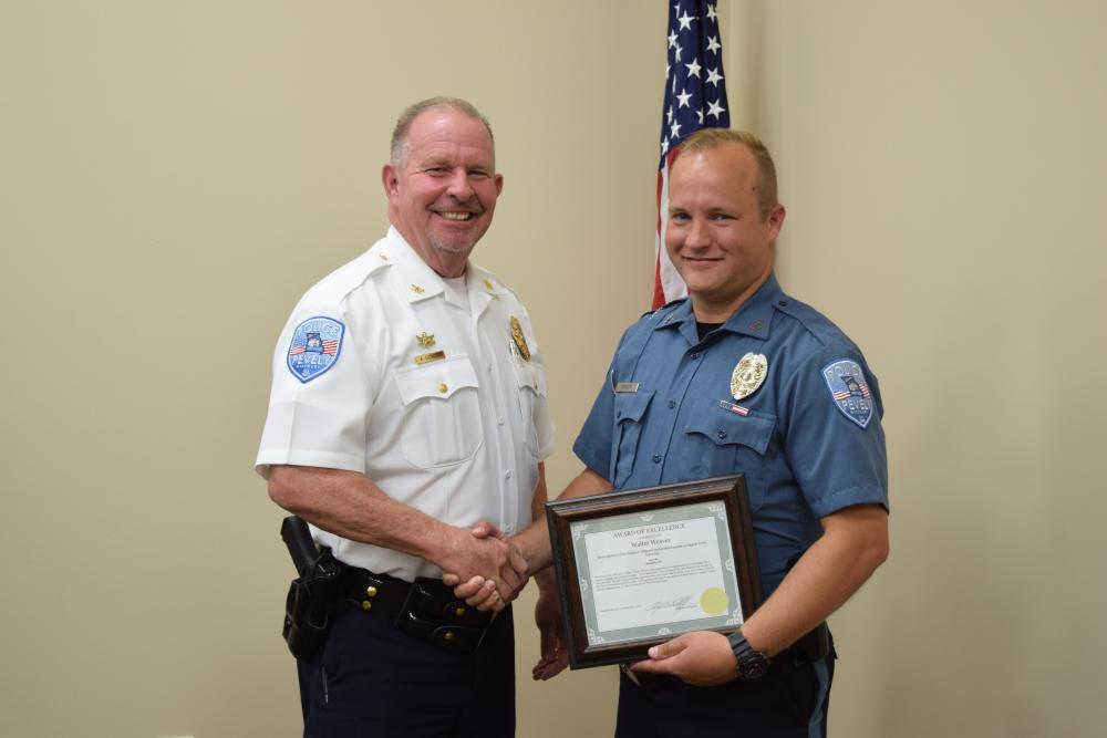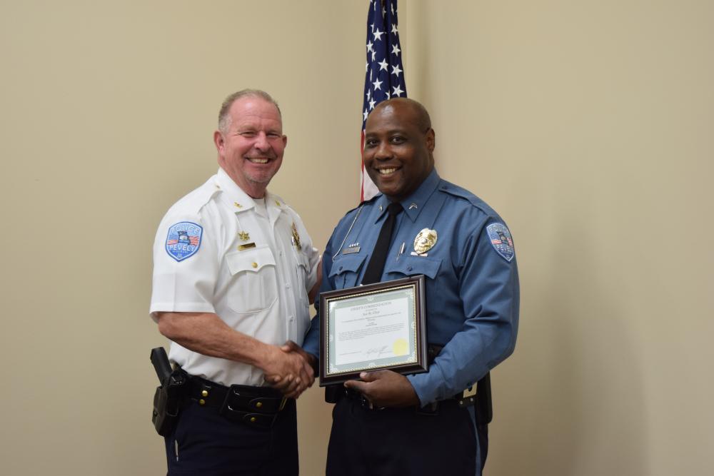 Older officer holding certificate and shaking another officers hand